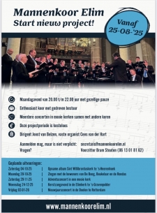 Hoe kan ik aan dit project meewerken? Loop op 25 augustus bij de start van het project gewoon binnen, aanmelden is niet verplicht maar mag wel via secretaris@mannenkoorelim.nl Heeft u vragen hierover, stel ze gerust aan de voorzitter Bram Stouten via 06-13018162